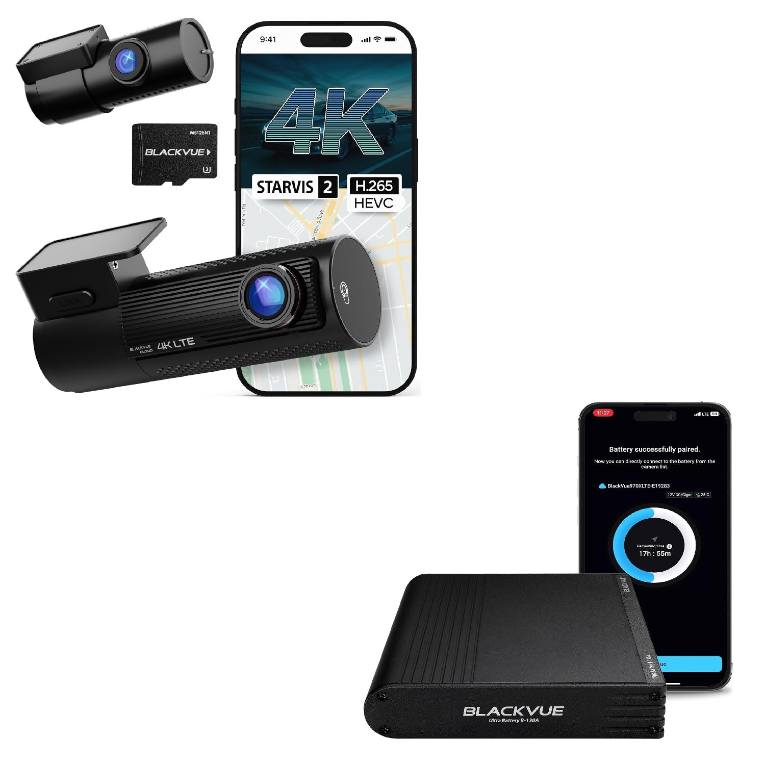 This bundle contains the Blackvue DR970X-2CH LTE Plus II and the Blackvue Ultra Battery B-130A